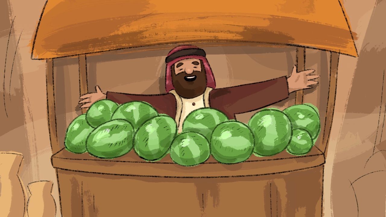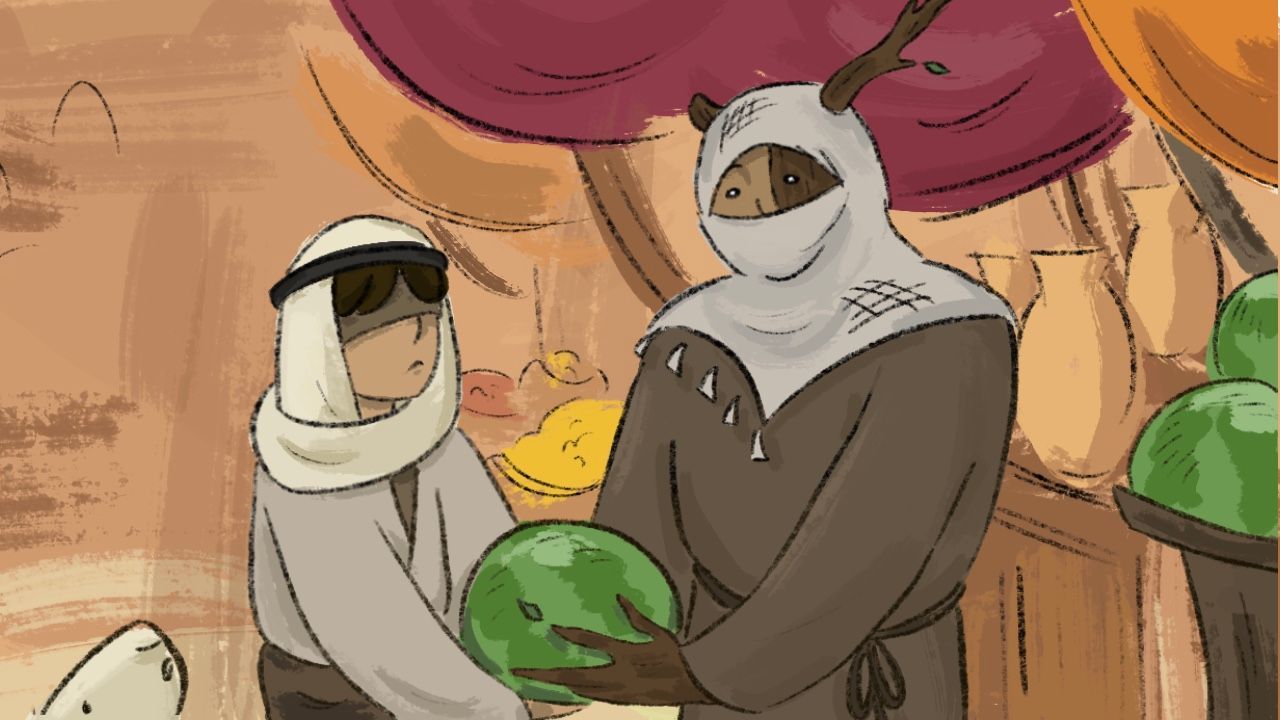 Suddenly, a tall and scary-looking beast enters the market, causing everyone to panic and leave. Despite the commotion, Ahmed stays calm and trusts Zamzam's instincts. Surprisingly, Ahmed remains unafraid and reveals that he cannot see. As they talk, Ahmed's bravery and trust in his instincts make an impact on the man. They search for the perfect watermelon together and then head back to Ahmed's hut.