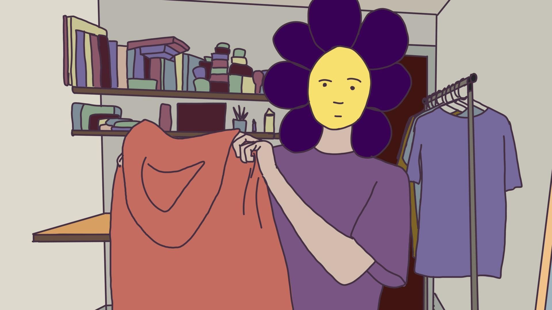 The story begins with the protagonist trying on T-shirts and asking a friend for advice on which one is best. After he tries on what a friend offered him, the form of the main character changes. He realizes that others see him differently than he sees himself. He begins to communicate with different people and constantly change his form,even without realizing it, to the way people see him, with whom he speaks. It all ends with him losing his face.