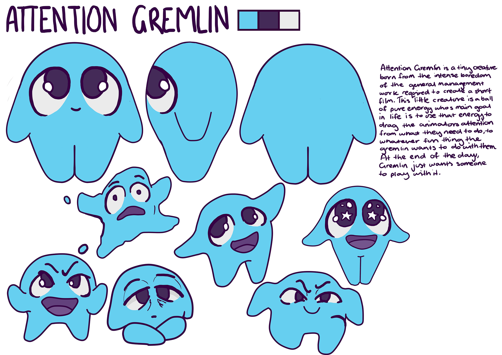 As an animation student, I get to follow my ideas to create projects I am passionate about. Despite this, there is much of the work that I would prefer not to do and struggle to complete without getting distracted. Attention Gremlin is a short film about the struggles with the wandering thoughts and concentration issues when completing the most boring and unappealing tasks required to complete university projects.