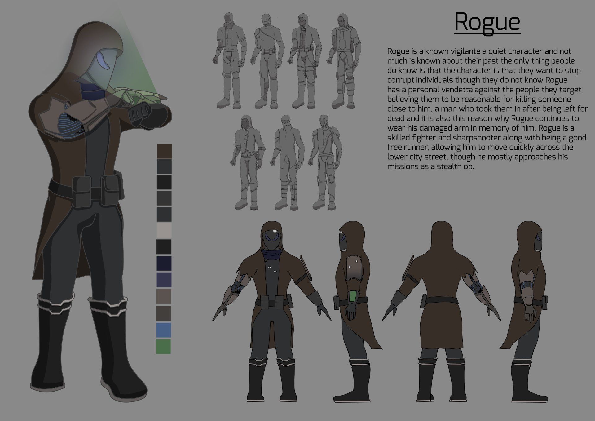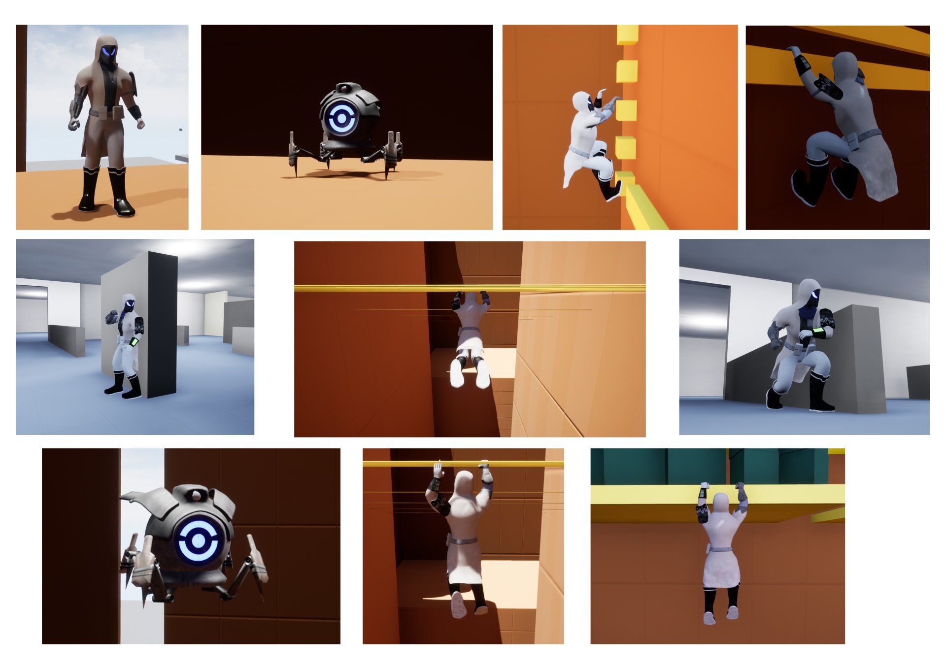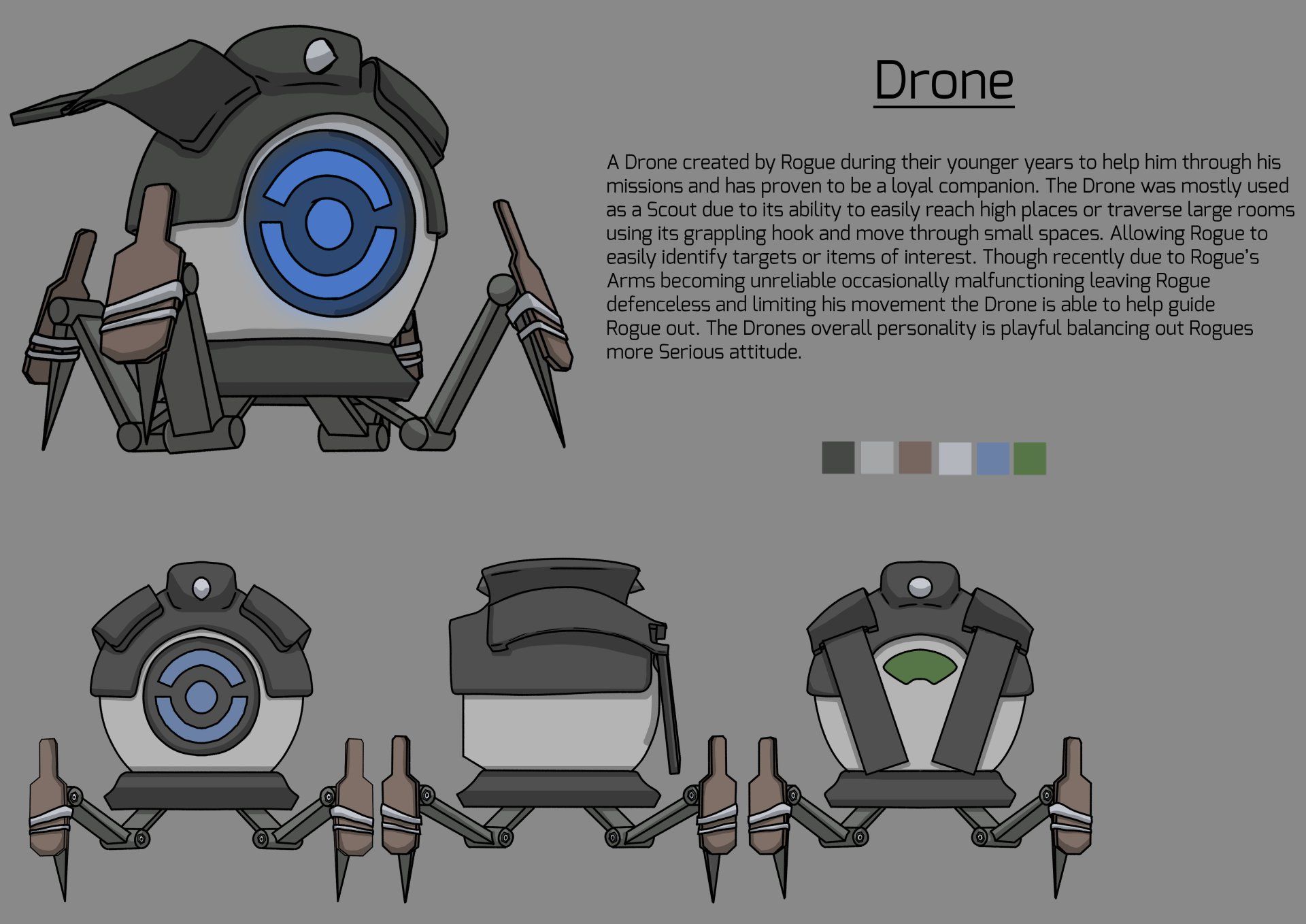 My final year project was focused around creating animations for games with the goal being to have created at least two characters with one being a biped and the other being a 3 legged plus and produce a set of animations for each character which could then be placed into a game engine with the final goal being to create a walkthrough showing off these animation in a game engine of my choosing. This project required me to learn about the difference between film and gaming animations but also required me to learn a new skill by having to program these into Unreal.
